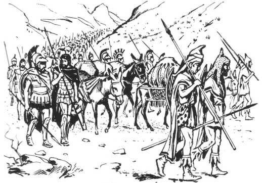 Таким образом, воины вербовались и собирались с соблюдением всех правил конспирации. Так для похода было собрано 13 тысяч воинов, в том числе 11 тысяч гоплитов и две тысячи пельтастов [3]. Никакой единой четкой структуры эта армия изначально не имела отрядами воинов командовали люди, их набиравшие. Отряды делились на более мелкие тактические единицы лохи, которыми командовали лохаги. Из текста «Анабасиса» остается неясно, закупил ли Кир для воинов оружие или они прибыли на службу со своим [4].