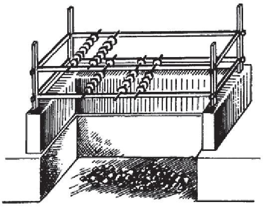 Длина и ширина аналогичны длине и ширине ямы для завяливания чая, высота составляет один фут, данный навес разделен на два помоста. Высота нижнего помоста от пламени от древесного угля составляет около двух футов (то есть немного выше стенки, расположенной внизу), а верхний помост на один фут выше нижнего.