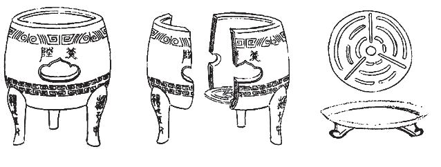 Фитиль печи помещался в заплечик. Над фитилем располагались три выпуклые решетки. На одной из решеток был изображен длиннохвостый фазан, символизирующий огонь, соответствующий одному из восьми триграмм Иицзина «Ли» (离)56; на второй решетке был изображен тигр, символизирующий ветер, поэтому соответствует одной из восьми триграмм Иицзина «Сюнь» (巽)57; на третьей решетке была изображена рыба, символизирующая воду, поэтому соответствует триграмме «Кан» (坎)58. Энергия ветра разжигает огонь, а на огне можно кипятить воду, поэтому именно эти три явления и образы, выражающие триграммы, были выбраны в качестве украшений.