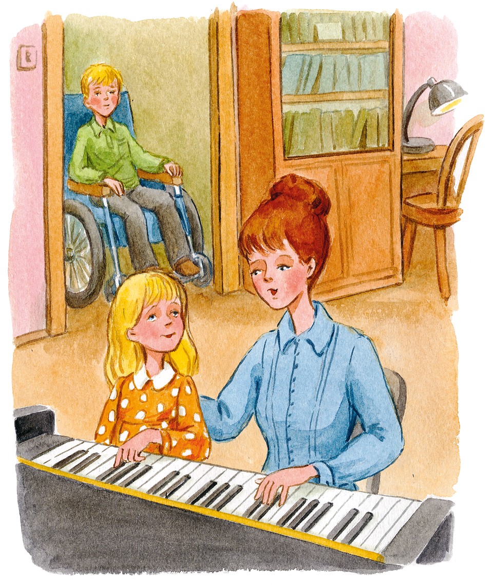 Она села рядом с девочкой. Олауг стала играть одним пальцем в высоких регистрах, а Эва играла на басах. Получилось очень красиво, мелодии объединились, и вышла та самая песенка.