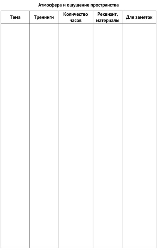 Графа «для заметок» предназначена для вашего удобства, и чтобы ничего не забыть. Вы можете помечать нюансы, которые возникли во время работы с тренингом, чтобы потом можно было внести правки или немного изменить упражнение под потребности, возможности, возраст детей, ситуацию, цели или имеющиеся ресурсы; помечать на чем сделать акцент в следующий раз, что получается или нет у детей; прописывать что нужно сделать или не забыть во время тренинга необходимый реквизит, текст, названия эмоций, ассоциаций, предлагаемых обстоятельств, заданий; домашнее задание для учеников; рефлексию заранее подготовленный текст для ее проведения или то, что вы должны учесть после ее проведения. Также, чтобы не потерять важное и понравившееся упражнение для занятий.