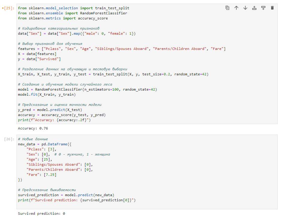 Таким образом, вы можете использовать обученную модель для предсказания выживаемости на основе данных о пассажирах.