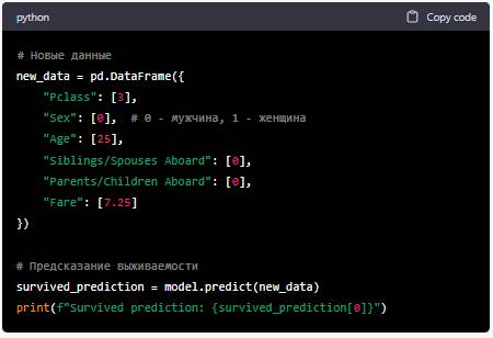 Теперь, когда модель обучена, вы можете использовать её для предсказания выживаемости на новых данных.