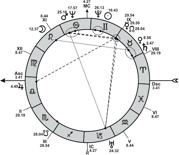 Причем насчет последнего есть определенные сомнения. Хотя по формальному правилу он не «дотягивает» до девятого дома, поскольку расположен на расстоянии больше 1 градуса от его куспида, Восходящий узел соединяется с Меркурием. А Меркурий расположен точно на куспиде девятого дома и потому «притягивает» сюда Восходящий узел. Можно сказать, что в этом случае роль Восходящего узла двойственна: он связан и с восьмым, и с девятым домами. Позже мы увидим, как это проявилось в судьбе Кусто.