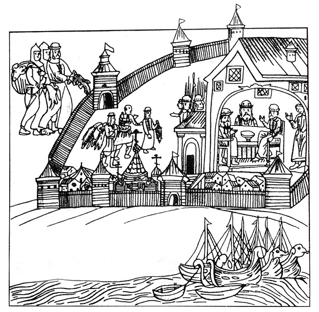 Рис. 1. Сдача ясака в Тюмени. Рисунок С. У. Ремезова из его «Служебной чертежной книги» 16991701 годов