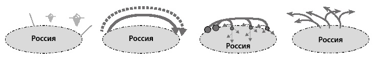 Эта модель имеет сходство с обеими предыдущими (рис. 4). Как и в транзитной модели, здесь не принимается во внимание пересекаемая территория/акватория; это тоже караванный путь из точки А в точку Б, но точка А находится не на Западе, а внутри Сибири, в то время как точка Б внешний, за пределами СМП, пункт назначения продукции. Транзитная модель представима линией, вывозная отрезком, центр-периферийная древовидной формой.