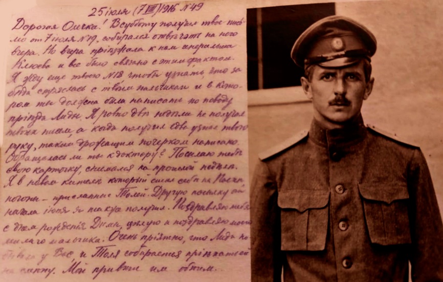 Дорогая Олечка! В субботу получил твое письмо от 7 июля 19. Собирался отвечать на него вчера, но вчера приехала к нам генеральша Клюева, и все было связано с этим фактом. Я жду еще твоего 18, чтобы узнать, что случилось с твоим пальчиком, и в котором ты должна была написать по поводу приезда Лиды. Я ровно две недели не получал твоих писем, а, когда получил, едва узнал твою руку, таким дрожащим почерком написано. Обращалась ли ты к доктору? Посылаю тебе свою карточку, снялся я на прошлой неделе. Я в новом кителе, который сшил себе на Пасху, погоны присланные Толей. Другую посылку от начала июня также получил. Поздравляю тебя с днем рождения Димы, целую и поздравляю моего милого мальчика. Очень приятно, что Лида побывала у Вас, и Толя собирается приехать ей на смену. Мой привет им обоим».