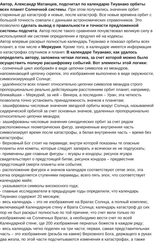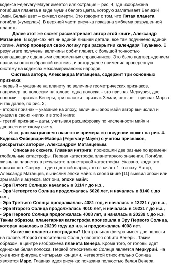 Автор этой книги, Александр Матанцев, по сущеcтву, поднял знамя исследований планет через кодексы, которое впервые осуществил Иммануил Великовский. Автор впервые в мире раскрыл полностью календарь Тиуанако, опубликовал результаты в своих книгах [13, 14, 21, 30].