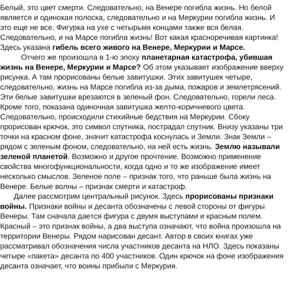 Следует обратить внимание на лица венерианцев. Лицо справа красного цвета, красный это цвет агрессии и войны. Значит десант из 700 участников на НЛО или другим способом посылается на Землю не просто так, а с целью войны и завоевания. Смотрим еще более внимательно на это красное лицо. На нем специально выделена часть зубов, их четыре. Четыре это признак Марса. Получается, что марсиане присутствовали на Венере и в данном случае они также имеют агрессивные намерения против землян. Теперь смотрим на левого венерианца. У него лицо серого цвета и только зубы на красном фоне. Значит, он не так сильно агрессивен. Оба венерианца держат землянина за руки. Один за левую, другой за правую, возможно, таким образом показано, что колонизированы две части Земли разными агрессорами с Венеры и Марса.