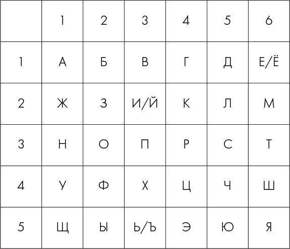 Оригинальный квадрат Полибия представлял собой таблицу 5 × 5 клеток, в каждой из которых подходила буква. В русском алфавите 33 буквы, поэтому мы воспользуемся таблицей 6 × 5. В нашем квадрате буквы Е и Ё будут записаны под одной цифрой. Также поступим с И и Й, Ъ и Ь. Первая цифра каждого числа ряд, вторая столбик.