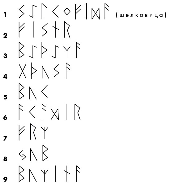 Взломав шифр, прочтите руны. Каждая руна одна буква. Если первая группа рун читается как ШЕЛКОВИЦА, названия каких деревьев закодированы в следующих строках?