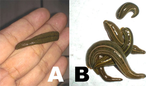 Рис. 2. Пиявка японская (Hirudo nipponia, Witman, 1886): A фото от 14.09.2017; B фото по материалам сайта http://bio113.weebly.com/hirudo-nipponia.html