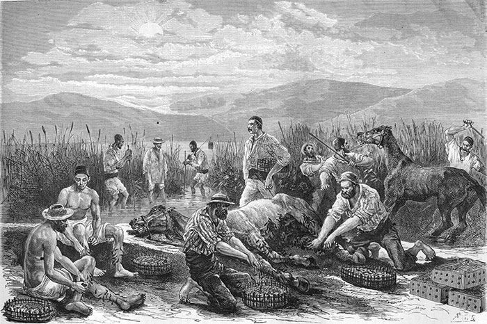 Рис. 5. Ловля медицинских пиявок на озере Copais, Греция. Литография H. Belle из журнала Le tour du Moude,1876 (Личный архив)