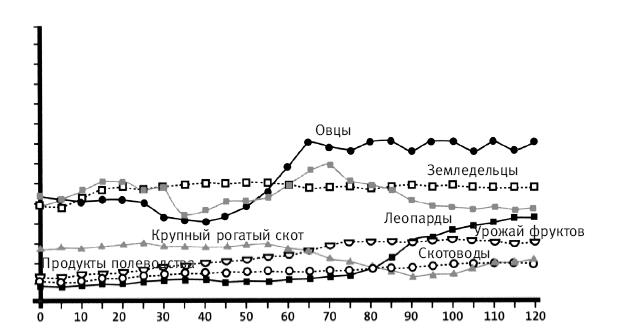 Рисунок 2 показывает результат «управленческой деятельности» среднестатистического участника эксперимента. Мы видим, что численность населения земледельцев тупи поначалу растет. Главным образом это объясняется улучшением питания и организацией медицинского обслуживания. Благодаря этому выросло количество детей, а случаи их смертности снизились. Повысилась и продолжительность жизни в целом. После первых трех сеансов работы испытуемые думали, что им удалось решить проблему. У них не возникло ощущения, что своими мерами они заложили бомбу замедленного действия. Они были совершенно ошарашены случаями голода, почти неизбежно наблюдавшимися в последующие годы.