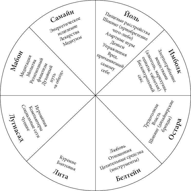 Все зависимости попадают в теневой аспект первого цикла. Однако дальнейшая классификация показывает, насколько разные зависимости могут соотноситься с энергиями Колеса года.