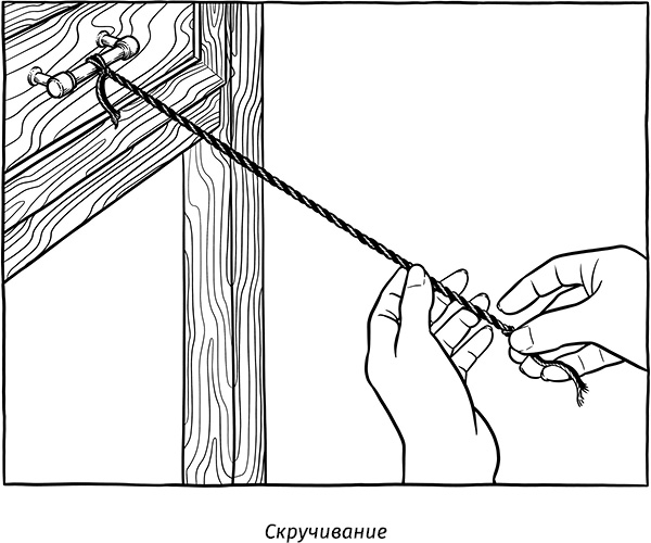 При создании веревки задействуются физические особенности процесса скручивания. Если закрутить вместе две или более нити, они развернутся обратно, если их отпустить, даже если связать концы. Фокус в том, чтобы сложить закрученные нити пополам. Обе половины веревки будут зеркально отражать друг друга направление скручивания одной будет противоположным другой. Если после этого отпустить нити, они автоматически закрутятся друг вокруг друга.