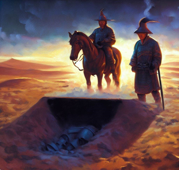 Он был одет в красный кафтан, шитый золотыми нитями, и высокие сапоги с загнутыми вверх носками. Он пил чай из золотой пиалы. Рядом лежал меч, рукоять которого переливалась на солнце от большого количества драгоценных камней. Перед ним, почтительно склонив голову, стояли три человека. Властные лица, немного раскосые глаза, дорогие кафтаны, сапоги, тяжелые золотые пряжки ремней. Люди, привыкшие повелевать жизнями других. Но сейчас они почтительно склонились над лежащим на шкурах человеком и внимательно ловили каждое его слово боясь пошевелиться.