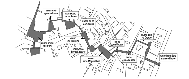 В Венеции казни обычно осуществлялись через повешенье, почти всегда между колонн на пьяцетте Сан-Марко. Порою имело место и отсечение головы, обычно сопровождаемое четвертованием осужденного. При этом части его тела подвешивали в четырех разных углах города. Тому же, кто запятнал себя особо тяжким злодеянием, отсекали кисть (порою обе) на месте преступления. С культями, перемотанными, чтобы не дать умереть от потери крови, и с собственными кистями, подвешенными к шее, осужденного доставляли к месту казни по Каналь Гранде на специальном суденышке. Окончательно приговор приводился в исполнение на эшафоте при помощи топора. Для описания участи осужденного в венецианском диалекте существовал специальный глагол descopà, который не так-то просто перевести на итальянский[14]. Теперь ступайте на калле дрио ле Скуоле (calle drio le Scuole, «позади Скуолы»), которая переходит в фондаменту Джачинто Галлина (fondamenta Giacinto Gallina). Потом пересеките понте де ла Панада (ponte de la Panada) и следующий за ним понте дель Пьован (ponte del Piovan). Когда вы сойдете с моста на набережную дель Пьован, у вас будет возможность полюбоваться задним и боковым, выходящим на воду, фасадом церкви Санта-Мария-деи-Мираколи (Santa Maria dei Miracoli, «Дева Мария чудес»). По традиции считается, что она сооружена из плит наилучшего мрамора, оставшихся при строительстве собора Св. Марка. Еще несколько шагов и вот вы на кампо Санта-Мария-Нуова (campo Santa Maria Nuova), которую следует пересечь по диагонали, чтобы выйти на калле дель Спецьер (calle del Spezier).