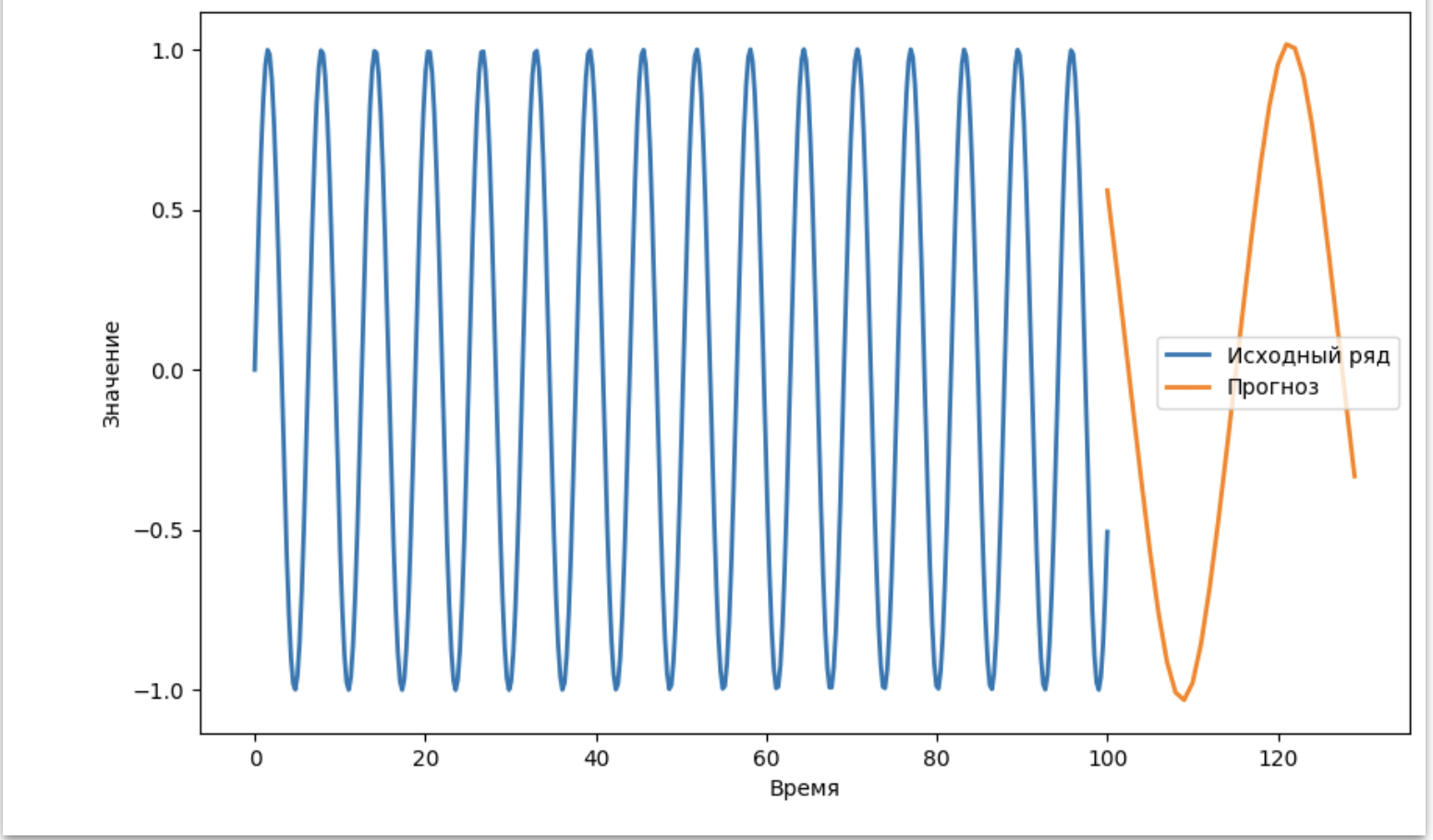 Этот пример демонстрирует, как можно использовать LSTM для прогнозирования временных рядов. Мы создаем модель LSTM, обучаем ее на исходном временном ряде и делаем прогнозы на будущее. Визуализация показывает, как модель способна улавливать долгосрочные зависимости в данных и строить прогнозы.