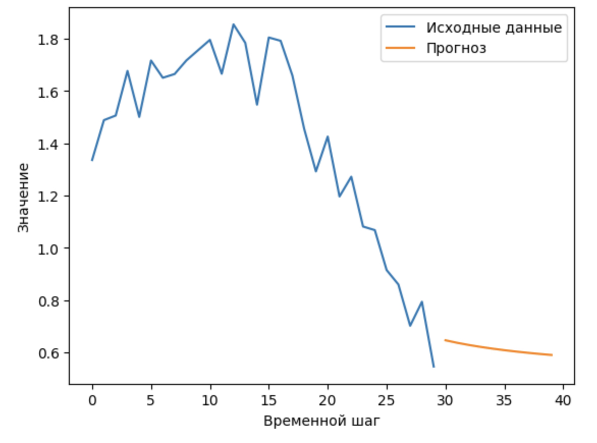 Из этой визуализации можно оценить, насколько хорошо модель справилась с задачей прогнозирования временного ряда. Оранжевая линия отображает прогнозируемую часть временного ряда на будущее. В зависимости от точности модели и сложности данных, результаты могут быть близкими к исходным данным или иметь некоторую степень погрешности.
