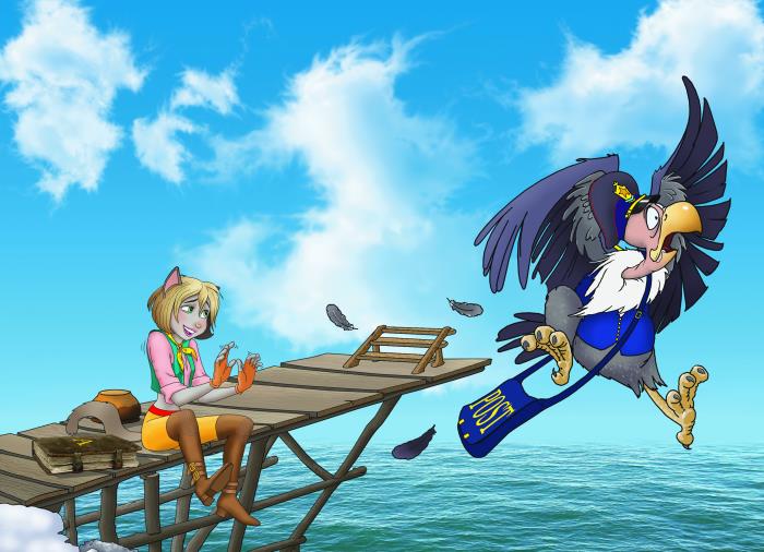 Незваным гостем оказался немолодой уже кондор: через левое крыло переброшен ремень синей сумки та явно мешала ему взлететь. Птица молча остановилась напротив Джен. Сбросив ремень, освободилась от груза, размяла плечи и взъерошила помятые перья. Щелкнув парой пряжек, откинула крышку сумки: