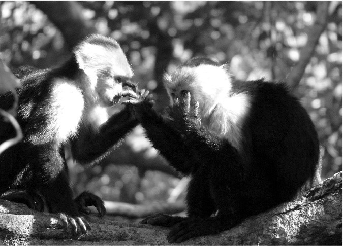 Илл. 1. Белоплечие капуцины Коста-Рики придерживаются необычных социальных условностей, варьирующихся от популяции к популяции. На снимке две взрослые самки Румор и Седония из Пелонской стаи демонстрируют любопытную местную традицию обнюхать руки партнера и воткнуть палец в его глаз. Манеру тыкать пальцем в глаз, предположительно, завела Румор, за которой числится не одна инновация. Снимок публикуется с разрешения Сьюзан Перри (Susan Perry)