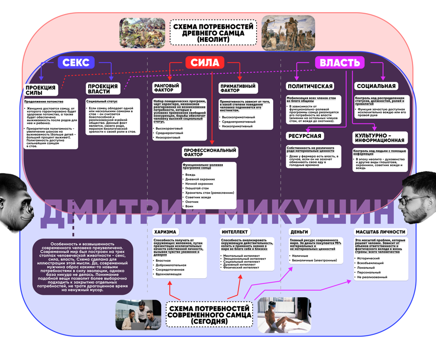 Сила, Власть, Секс три столпа на которых держится цивилизация и происходит эволюция вида изо дня в день. Дабы не быть голословным, я засунул куда подальше пирамиду Маслоу (как система потребностей современного человека может иметь строгую вертикаль в форме пирамиды? Человек устроен КРАТНО сложнее того, о чем говорит Маслоу, и для меня загадка, в чем причина оверхайпа этой теории, почему все вдруг резко стали поклоняться этой кривой и косой системе потребностей и брать ее за абсолютную истину. Тем более Маслоу сам позже отказался от этой пирамиды, ведь понимал ее нелепость в современных (еще на тот момент) реалиях) и я создал свою схему потребностей самца в неолит и наше время, дабы показать абсолютную зависимость современного интеллигента от человека-прородителя современной цивилизации (Период : неолит, homo sapiens).