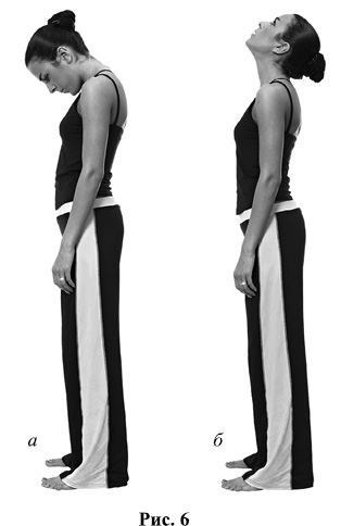 Займите исходную позицию, ноги расставьте немного уже ширины плеч. Начинаем покачивания головой. Сначала слегка наклоните голову вправо (рис. 5а), правое ухо направлено к правому плечу одновременно шумный короткий вдох носом. Затем наклоните голову влево (рис. 5б), левое ухо направлено к левому плечу одновременно сделайте вдох. Покачивайте головой, как будто вы кому-то говорите: «Ай-яй-яй, как не стыдно!» Обратите внимание, что корпус и плечи должны быть неподвижны. Нельзя поднимать или опускать плечи, нельзя подтягивать плечо к уху. Работает только голова. Одновременно с каждым покачиванием выполняется вдох. Всего движений в цикле 8. Затем отдых 34 с и новый цикл. Выполните 12 циклов.