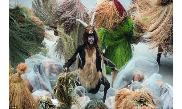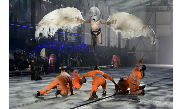 Главным действующим лицом был Демон, прибывший к людям на железнодорожной платформе. Первоначально он парил над сценой в виде ангела монстра женского рода, а затем двигался среди людей под видом чудища с козлиной (бараньей) головой. Народ внимал его идеям до тех пор, пока не появились три финансовых воротилы, логотипом которых был некий Змей (Дракон), с провозглашением победы над Демоном, что, понятно, «освободило» народы от влияния последнего и символизировало установление мира и порядка на планете (рис.1, 2).