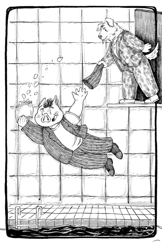 Чу и Барс молча (и быстро!) начали снимать одежду. Риз жестом велел им остановиться, что-то резко крикнув внутрь бассейна. Занимавшиеся там пловцы сразу устремились к барахтающемуся свину. Двое самых быстрых вместе с всплывшим после нырка Поршем попытались его ухватить, но безуспешно. Пузатый так махал руками и ногами, что надавал всем трём спасителям оплеух, а потом ещё и чуть не утопил и их, и ещё пятерых собак, которые вскоре подоспели на помощь. При этом он орал так, как пятьдесят младенцев