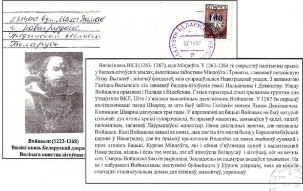 Вялікі Князь ВКЛ Войшалк. Канвэрт самвыдату (пярэдні і адваротны бок), які прайшоў пошту ў 2002