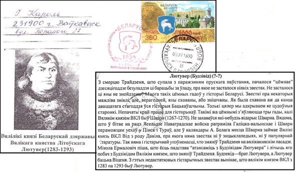 Вялікі Князь ВКЛ Путувер або Лютувер (12911295?). Канвэрт самвыдату, які прайшоў пошту ў 2005 (пярэдні і адваротны бакі)