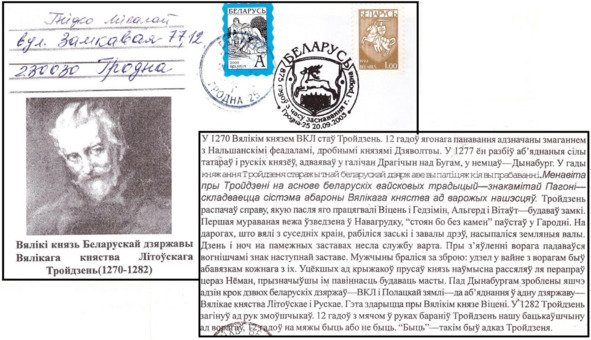 Вялікі Князь ВКЛ Трайдзень. Канвэрт самвыдату (пярэдні і адваротны бок), які прайшоў пошту ў 2003