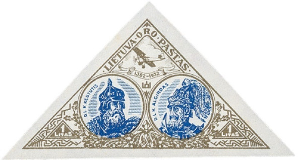 Вялікія Князі Вялікага Княства Літоўскага і Рускага Альгерд (1345 1377) і Кейстут (13811382). Марка пошты Летувы, выдадзеная ў 1932
