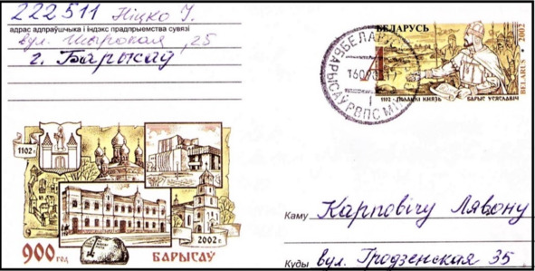 «900 год. Барысаў». Марачны канвэрт пошты Беларусі, выдадзены ў 2002