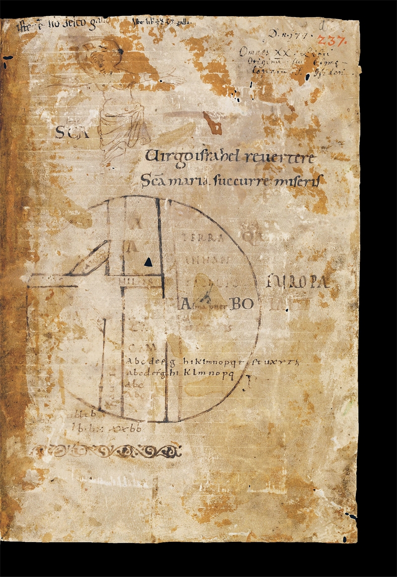 С. 15 Самая старая из сохранившихся карт эпохи Средневековья была нарисована в конце VII или начале VIII века. В ее верхней части мы видим Иисуса, возвышающегося над земным шаром с распростертыми руками. Африка подписана именем Хама, Ноева сына, который отправился на юг после Великого потопа. Это непросто разглядеть на репродукции, но Европа носит имя Иафета, а Азия Сима, других сыновей Ноя. К югу от Африки находится большая Terra inhabitabilis необитаемая земля. Две самые длинные полосы обозначают Средиземное море и неизвестное море южнее Африки, поперечные полосы реки Дон и Нил, а две диагональные полосы Азовское море. Подробнее на с. 8687.
