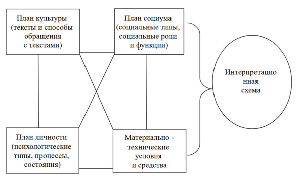 Пятый блок модели «интерпретационная схема» в латентной форме содержится внутри триады культура-социум-личность, то есть распределен среди всех трех блоков трех-местной модели. И действительно, способ интерпретации текста культуры содержится, как в самом тексте, так и в других текстах, а, в какой-то мере, в способе обращения с текстом, который передается по механизму культурной традиции. Таким образом, план культуры несет в себе и интерпретационную схему, без которой невозможно использование (чтение, понимание, создание) текстов культуры. Но и план личности также несет в себе эту схему, хотя и иным способом. Интерпретация текста функция живой человеческой личности. И эта интерпретация зависит от человека, от его культурного развития, культурной принадлежности, от его душевного настроя, наконец. Возьмем третий блок «план социума». Очевидно, что способ культурного взаимодействия людей не только предполагает использование тех или иных текстов, но и непосредственно представляет собой способ их интерпретации. Таким образом, выделение пятого блока в самостоятельную единицу определяется исключительно нашими исследовательскими задачами. Модель всего лишь теоретический инструмент, который может быть сконфигурирован тем или иным способом в зависимости от задач, решаемых нами.