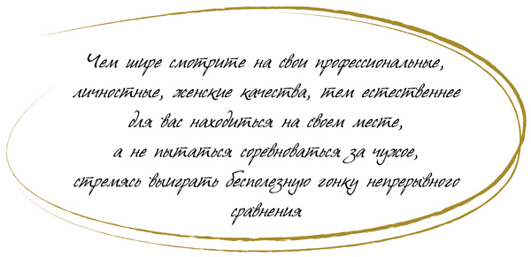 В одном кругу вы превосходите всех, а в другом одна из многих или даже в чем-то уступаете. Чем шире смотрите на свои профессиональные, личностные, женские качества, тем естественнее для вас находиться на своем месте, а не пытаться соревноваться за чужое, стремясь выиграть бесполезную гонку непрерывного сравнения.