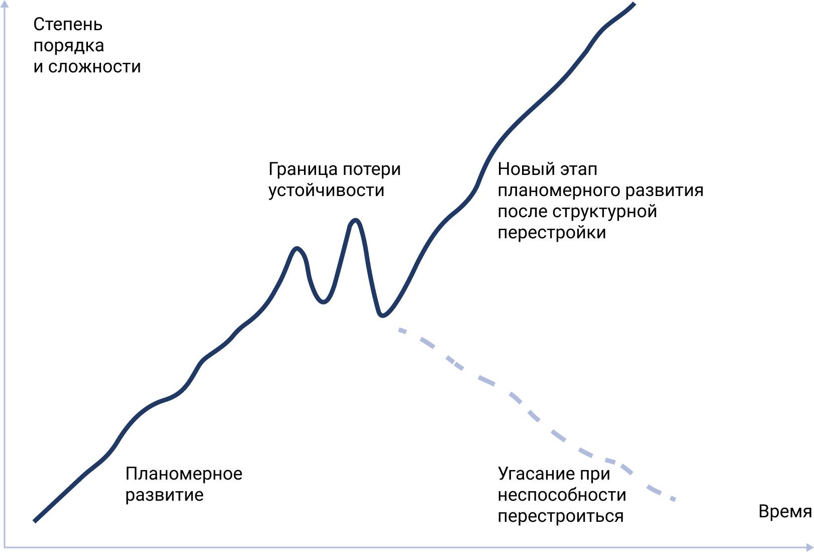 В силу вышесказанного бизнес-системы подчинены логике развития живых систем: существуют этапы устойчивого развития, на которых растущая компания, поступательно развиваясь, уходит все дальше от положения равновесия, но периодически она проходит через периодические скачкоообразные структурные трансформации, результатом которых является либо переход на новые уровни развития, либо разрушение или медленное угасание (см. рис. 8).