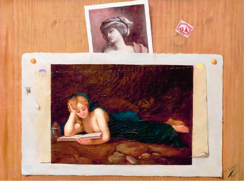 Склонившийся над фолиантом монах, размышляющая над Священным Писанием Мария Магдалина, светская дама с томиком на лоне природы такие образы привлекали внимание, заставляя пристально вглядываться в слои краски в поисках визуального подвоха. Элементы таких композиций могли быть узнаваемыми копиями существующих, ранее созданных картин например, знаменитого Корреджо или куда менее известного Эглона ван дер Нера. Копии были самого разного художественного уровня от виртуозно точных до откровенно топорных, имеющих весьма отдаленное сходство с оригиналами.