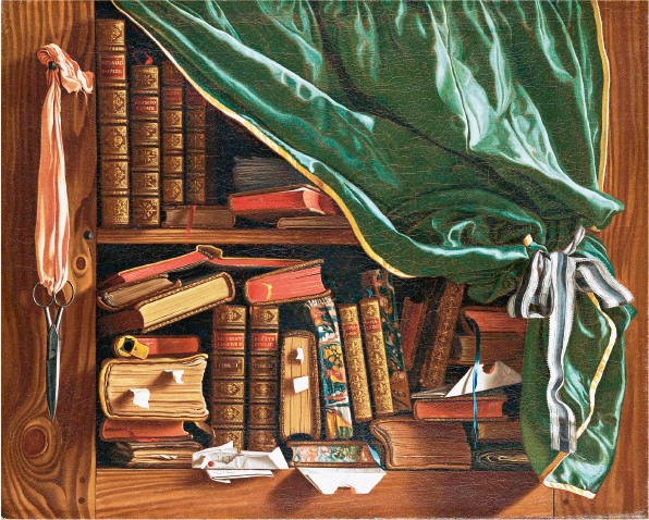 Книга как физическое воплощение духовной жизни попадает в тромплёй как в капкан, хитрую ловушку симуляций. Поглощенные текстом, увлеченные содержанием, мы временно забываем о его материальном носителе. Эффект тромплёя диаметрально противоположен: всем своим натуроподобием, всем своим визуальным очарованием он призывает забыть, что, помимо «тела», у книги имеется «мозг». Книга-вещь отчуждается от книги-текста. Редкий заказчик обманки просил запечатлеть в красках какие-то конкретные сочинения и свою преданность чтению. В основном заказывали просто приятные взору композиции с изображением томов наподобие серийных постеров, которыми сегодня украшают стены квартир.