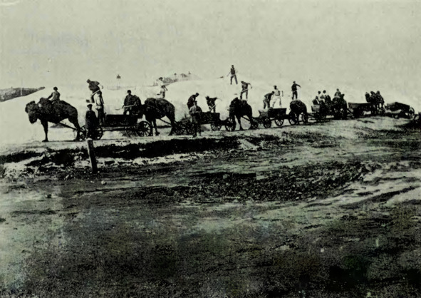 Озеро Баскунчак. Работы в озере. Подвоз промытой соли к полотну железной дороги и ссыпка ее в бугры