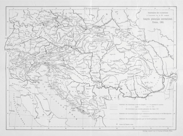Некоторые геологические экскурсии проходили до начала конгресса, другие же по завершении. Кроме того, заседания чередовались с короткими однодневными экскурсиями в окрестности Вены. Путеводитель общим объемом более тысячи страниц состоял из отдельных брошюр для каждой такой поездки. Геологическое строение территорий бывшей Австрийской Монархии чрезвычайно разнообразно, поэтому и экскурсии были самыми разными: палеозойские отложения Богемии, Остравско-Карвинский каменноугольный бассейн, отложения Альпийского триаса, ледник Карлсайсфельд и пр.167