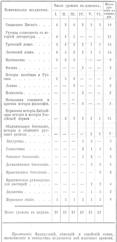 Духовные семинарии, по сути, были средними учебными заведениями. По Уставу 1884 г. учились шесть лет.26 Первые четыре класса были в основном общеобразовательные, а два последних года семинаристы постигали богословские предметы.27