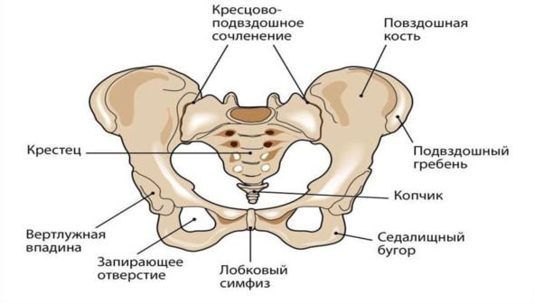 Таз представляет собой малоподвижное соединение нескольких костей: крестца, подвздошных (безымянных) и лонных.