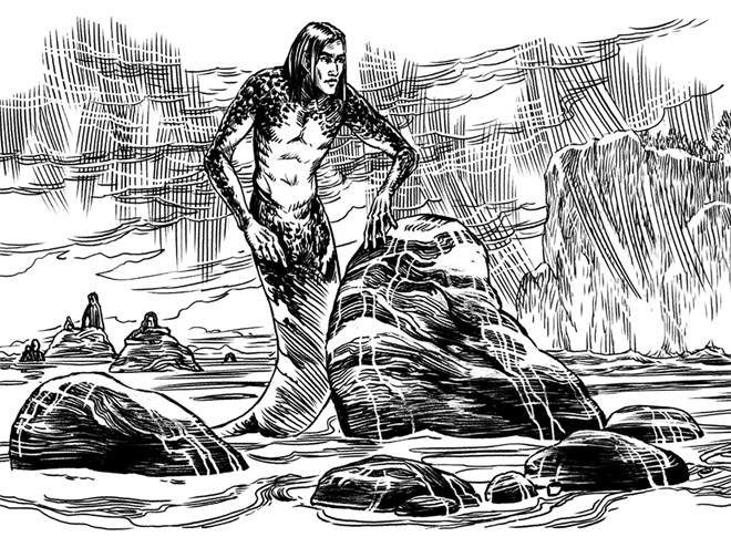 От камня что-то скользнуло по направлению к нему. Вскоре вместе с набежавшей высокой волной на берег выползло существо, похожее на человека и одновременно на змею. Нижняя его часть была полностью змеиной, покрытой черной блестящей чешуей с белесыми полосами, а вот верх укрывался чешуей лишь отчасти. Лицо, живот и шея были чисты и выглядели совсем человеческими; даже оттопыренные уши с жабрами тут же прижались к голове, перестав быть заметными.