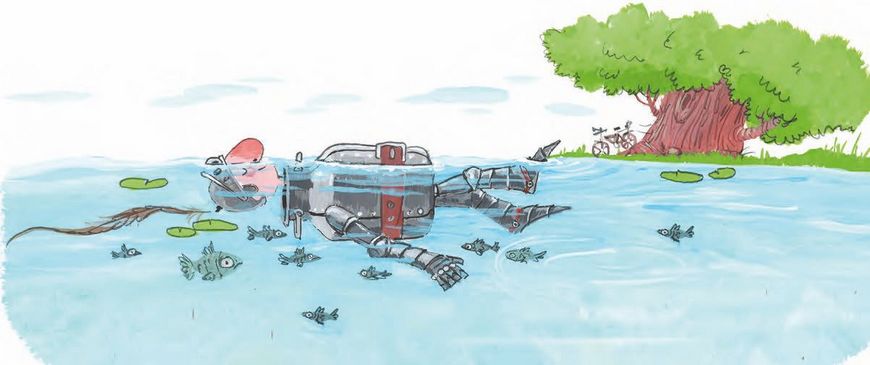 Плюх! Рыцарь замолотил по воде руками и ногами, но, к счастью, речка была мелкой, всего по щиколотку. Можно было лежать на дне, а нос торчал над водой.
