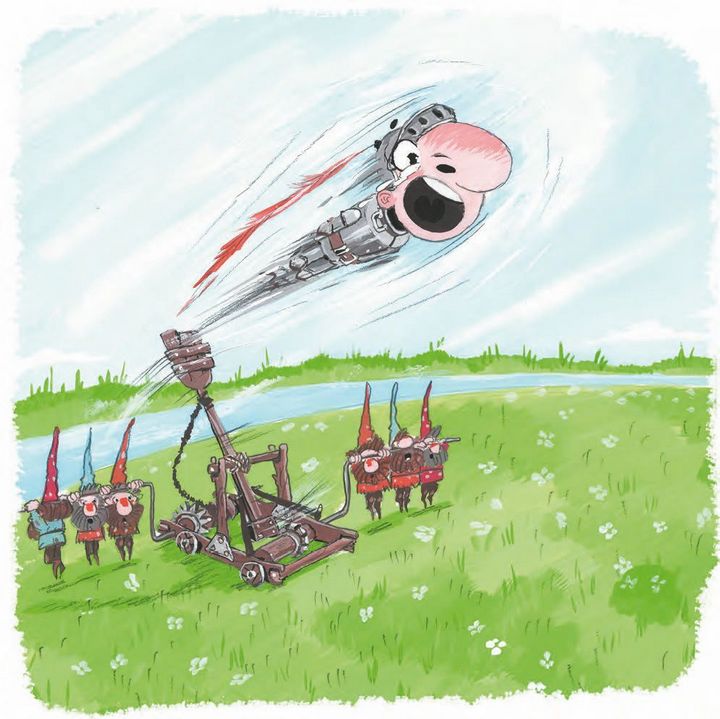 Стой! Стой! Не жми! истошно заорал Крендель, но было поздно. С дружным «Навались!» гномы повисли на рычаге. Шестерёнки завертелись с бешеной скоростью. Сэр Бидон зажмурился.