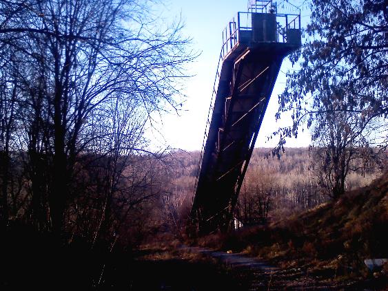 Другое дело подъемник справа от здания, он совсем новый и находится в вполне исправном состоянии, поскольку построен относительно недавно и успешно функционирует в зимний период. Для обслуживания подъемника на территории старой базы построен целый диспетчерский пункт, слегка облагорожен приток Десны и лыжный спуск. Подъемник ведет вверх к заброшенному трамплину на вершине горы давно не используемому, но все еще величественному сооружению. А на противоположной возвышенности находится, пожалуй, самое красивое место парка. Оттуда открывается вид на склон огромной горы, на старый подъемник с деревянным настилом, вдоль которого тянутся деревья, а внизу течет небольшая речка, скорее даже ручей со старым деревянным мостом, перекинутым через него. Ручей течет в глубине оврага и втекает в реку совсем недалеко от базы спасателей.