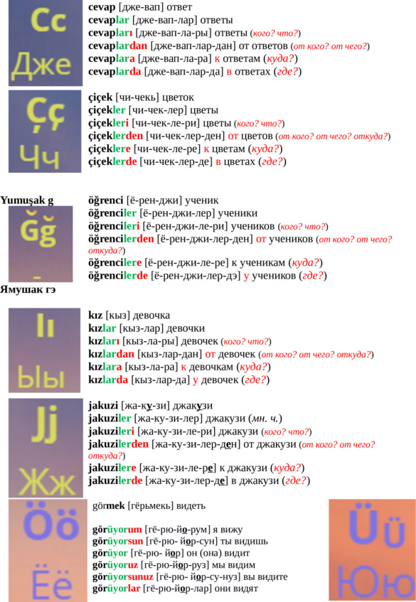 Буква «yumuşak ge» (мягкая ге) ğ не произносится, но удлиняет произнесение предыдущей гласной, например: